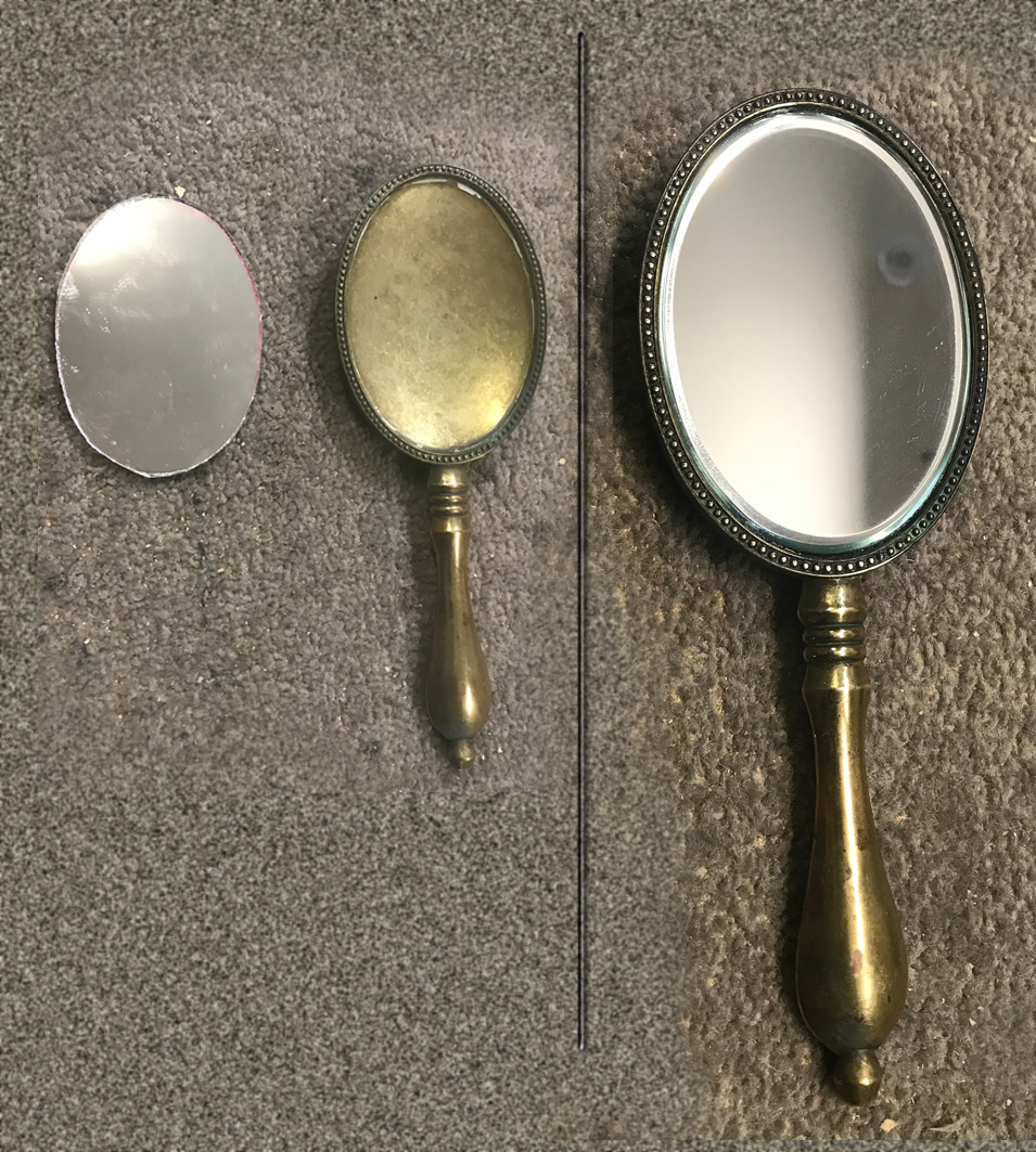 | New mirror was cut bevelled and fitted to this antique hand mirror |