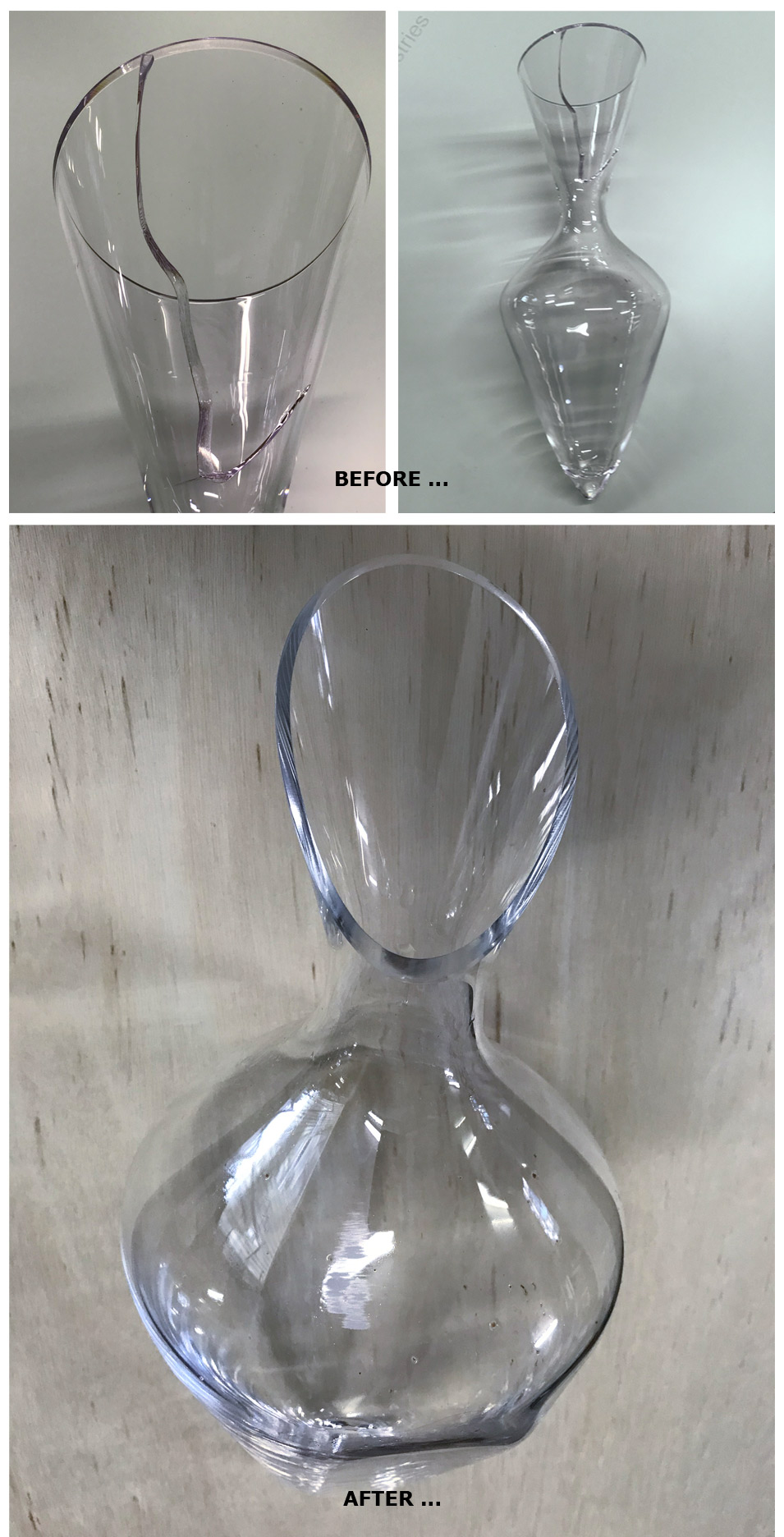 A customer’s Riedel wine craft with a nasty crack in the spout has been miraculously reshaped and polished by reclaiming |